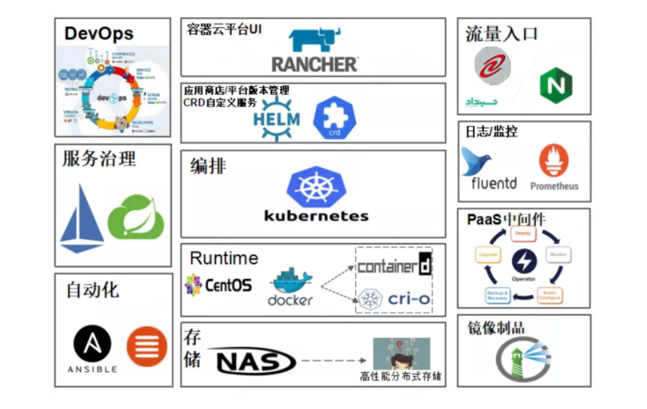 分层架构Kubernetes为核心组件的PaaS平台,整合EFK,Prometheus,Harbor等附加组件,PaaS服务分为三个平面,分别为管理平面、控制平面、计算平面。